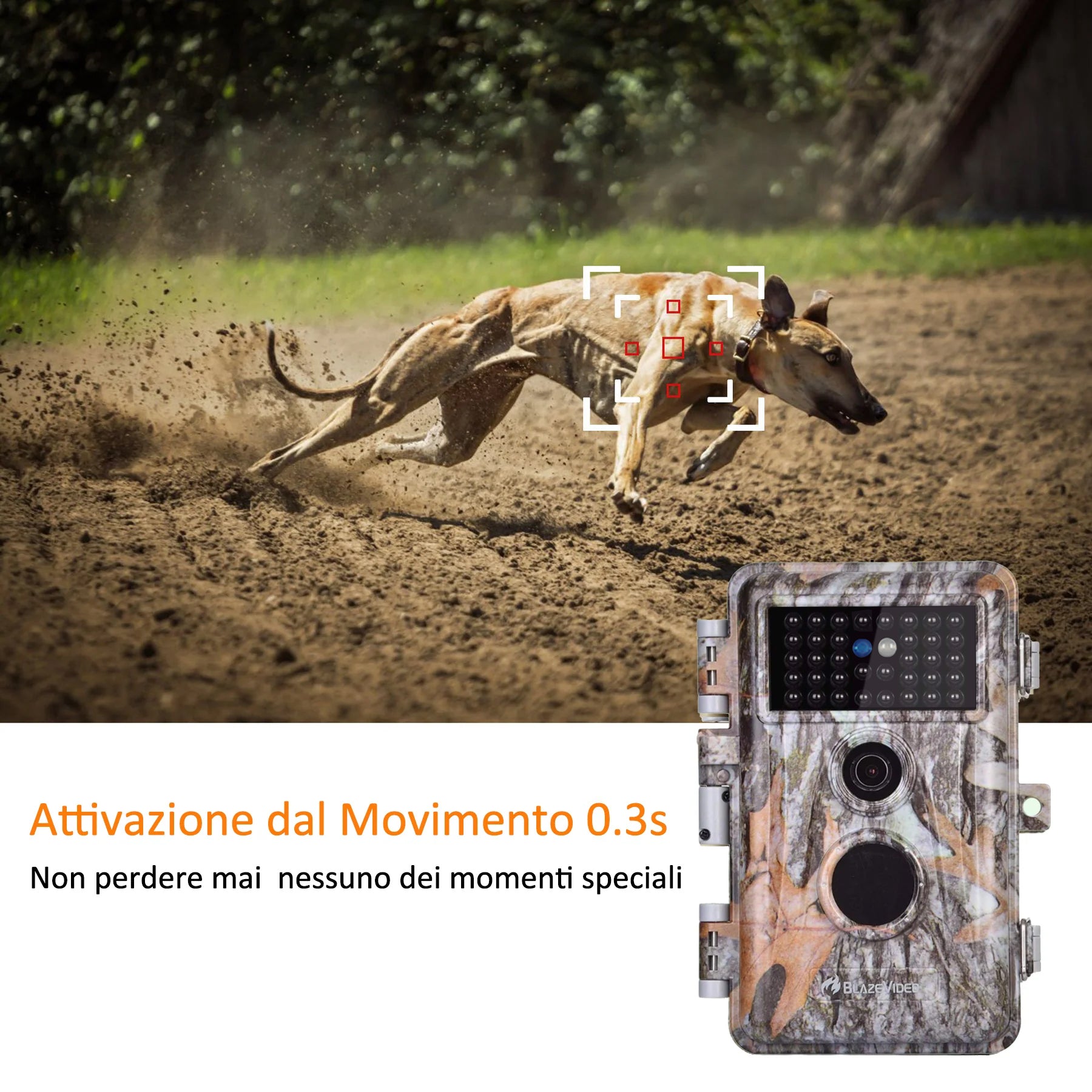 La fototrappola può catturare il momento più prezioso con una velocità di attivazione solo 0.3s e, equipaggiando di un rilevamento del movimento di PIR a 70°, godevi un ampio angolo di visione a 110°.