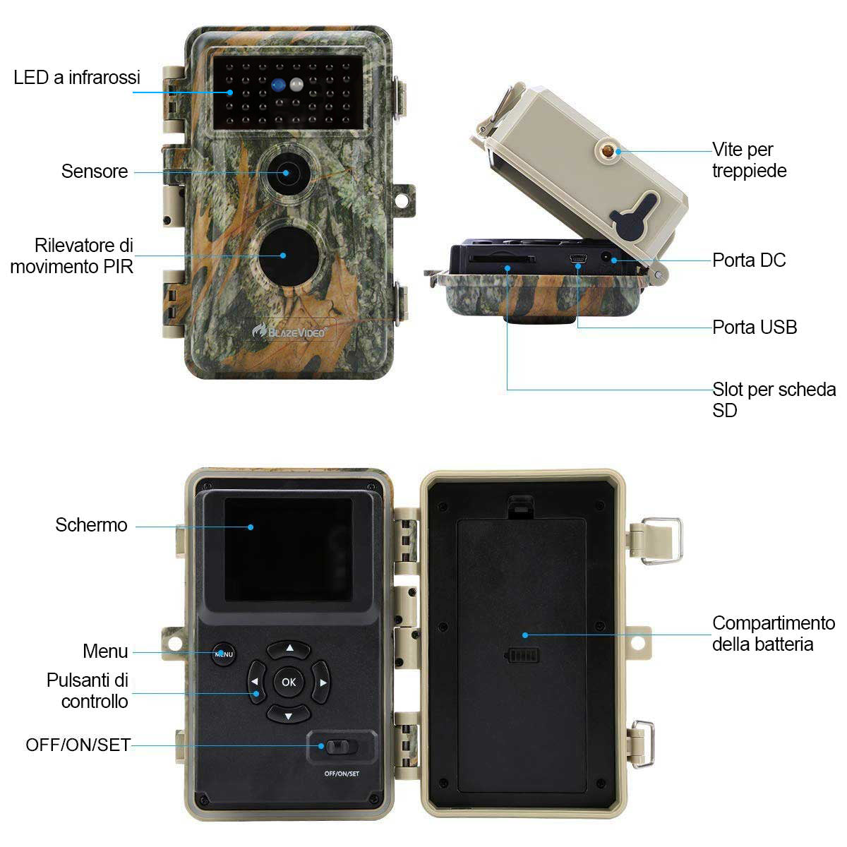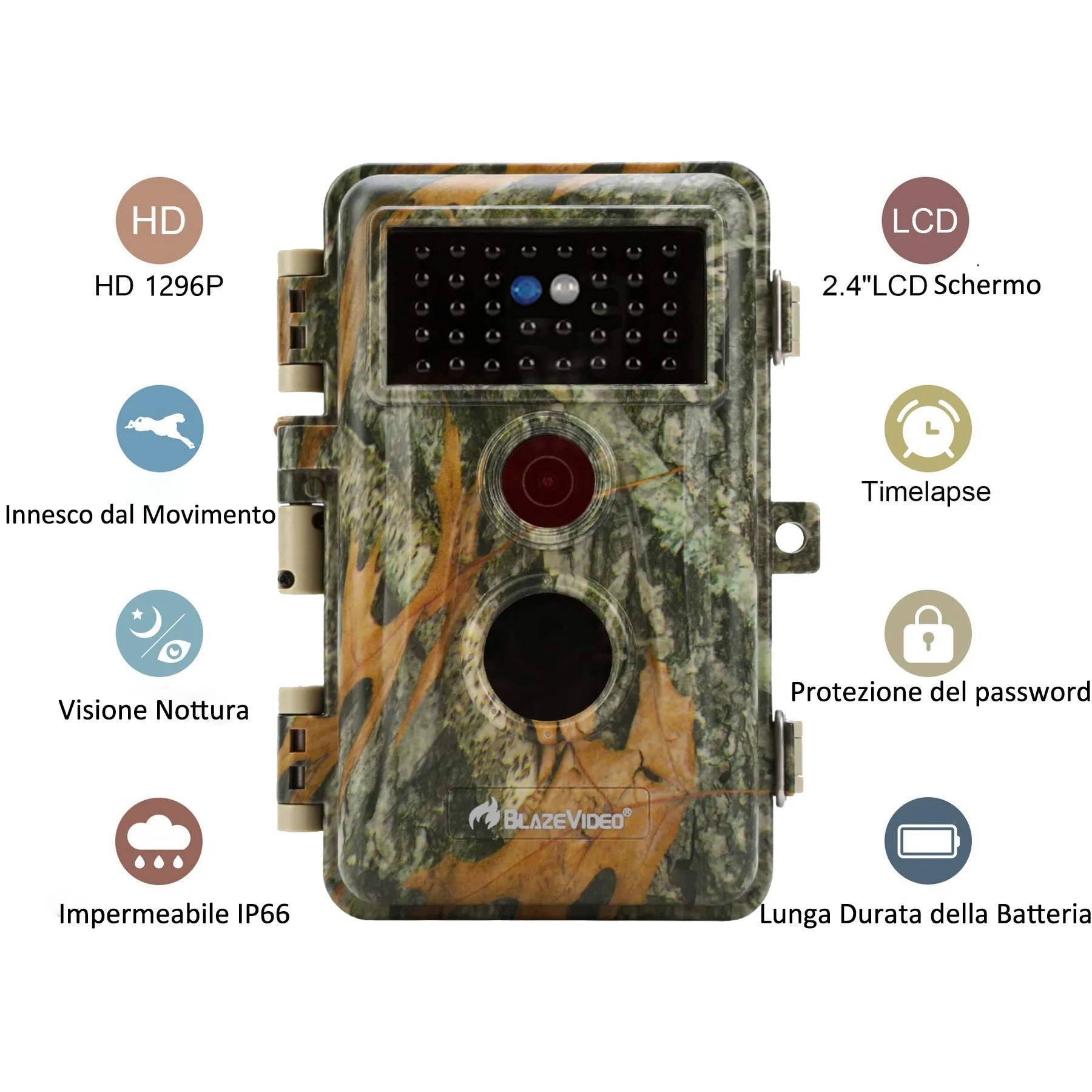 Grazie alla loro autonomia e durata, le videocamere Blaze Video possono essere utilizzate per molti scopi, e le seguenti caratteristiche aiutano: potenza della batteria, impermeabilità e mimetismo avanzato.