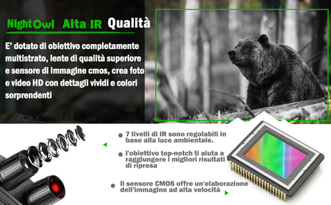 Se vi piace l’osservazione notturna degli animali o per la sorveglianza della casa o del bestiame, questo binocolo per la visione notturna è estremamente utile. Questo visore notturno cattura immagini e vide oin HD da 1280x960 pixel a 30 fps, anche al buio. I files possono essere trasferiti sul PC tramite il cavo USB per essere archiviati.